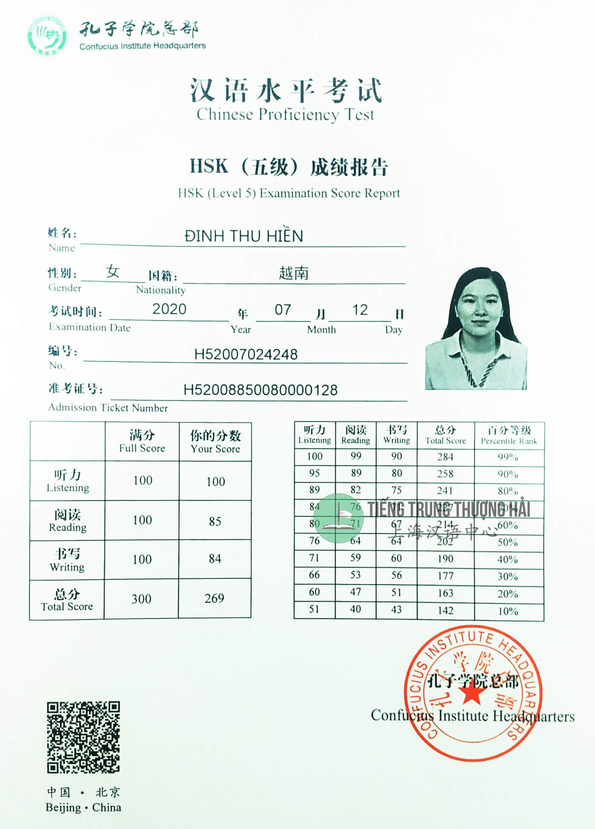 | Bạn ĐINH THU HIỀN Điểm số HSK5: 269 |