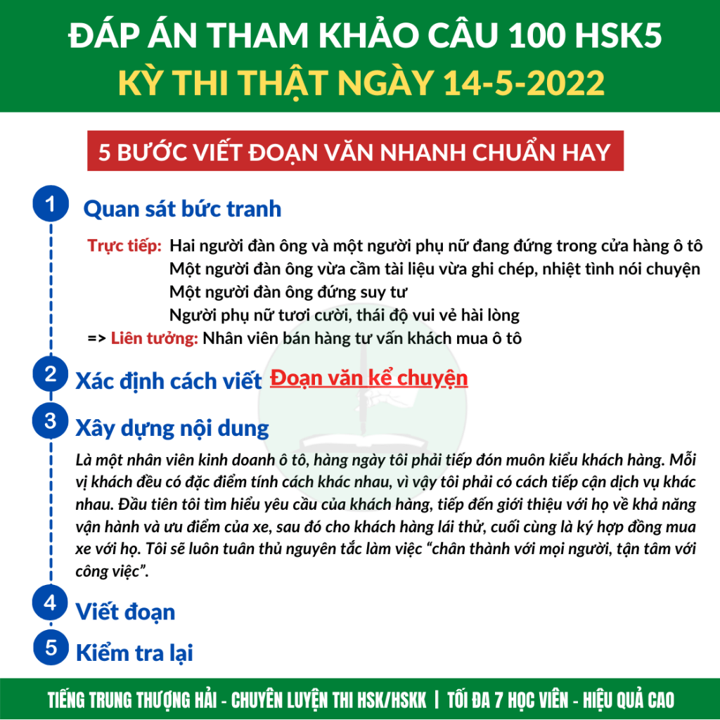Trong đề thi HSK5 phần thi nào khiến bạn lo lắng và không tự tin nhất? Nếu là phần viết thì sau đây Tiếng Trung Thượng Hải xin gửi tới các bạn ĐÁP ÁN THAM KHẢO PHẦN THI VIẾT HSK5 KỲ THI THẬT NGÀY 16-5-2022. Đặc biệt đối với phần viết đoạn văn, không chỉ cung cấp bài viết tham khảo, chúng mình cũng đã vạch ra chi tiết quy trình viết đoạn và cách xây dựng một đoạn văn 80 chữ nhanh, chuẩn, hay.
