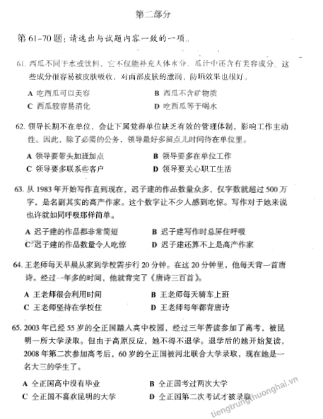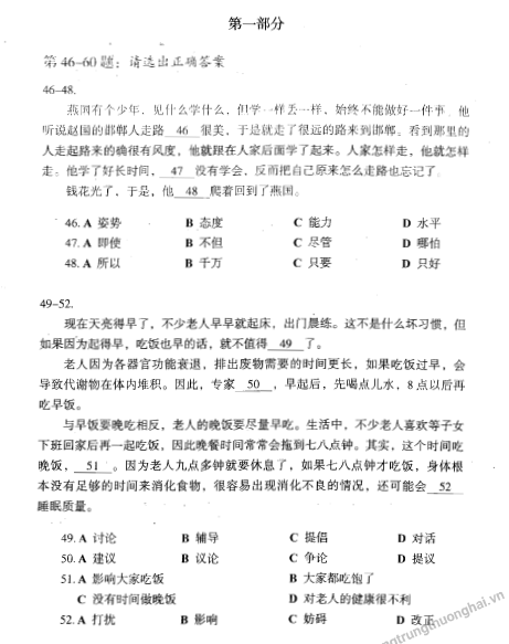 Với mỗi đề mô phỏng gồm 3 dạng bài thi phần Đọc hiểu mà các bạn sẽ gặp phải trong kì thi HSK5 là chọn đáp án đúng điền vào chỗ trống, chọn đáp án đúng với nội dung bài và đọc hiểu sau đó chọn đáp án đúng.